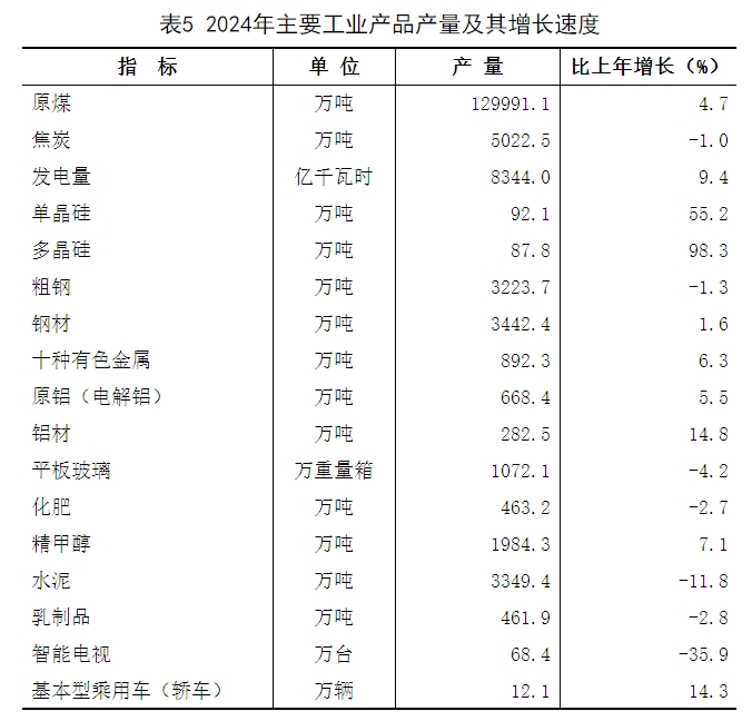2024年全年原煤产量129991.1万吨,比上年增长4.7%;发电量8344.0亿千瓦时,增长9.4%。规模以上工业企业产品中,焦炭产量5022.5万吨,下降1.0%;单晶硅产量92.1万吨,增长55.2%;钢材产量3442.4万吨,增长1.6%;原铝产量668.4万吨,增长5.5%;乳制品产量461.9万吨,下降2.8%。