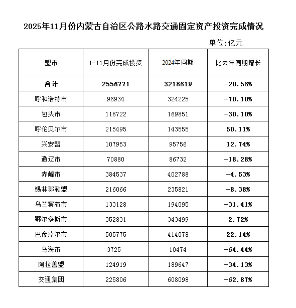 2025年1-11月份全区公路水路交通固定资产投资完成情况