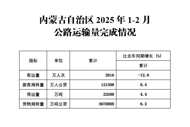 内蒙古自治区2025年1-2月 公路运输量完成情况