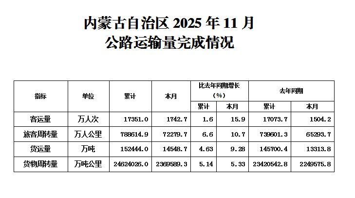 内蒙古自治区2025年1-11月公路运输量完成情况
