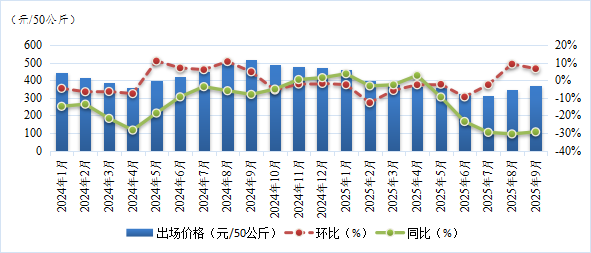 9月份全区每50公斤鸡蛋平均出场价格为366.66元,环比上涨6.51%,同比下降29.39%。从监测周期来看,9月3日、10日、17日、24日全区每50公斤鸡蛋平均出场价格分别为351.24元、361.81元、377.92元、375.65元。9月前三周,在各院校集中开学和中秋节前备货等提振下,鸡蛋价格持续回升;之后在蛋鸡存栏高位、节前备货临近尾声以及冷库鸡蛋出货等影响下,鸡蛋价格略有下降。