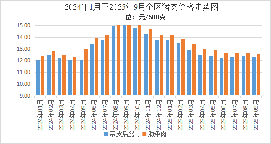 9月份,我区猪肉价格下降。其中猪带皮后腿肉价格各旬环比涨跌幅度分别为0.08%-1.29%0.00%,猪肋条肉价格各旬环比涨跌幅度分别为0.08%-0.48%0.16%。猪带皮后腿肉、猪肋条肉9月全区平均零售价格分别为每50012.28元、12.56元。环比,猪带皮后腿肉、猪肋条肉价格分别略降0.81%0.55%。同比,猪带皮后腿肉、猪肋条肉价格分别下降20.36%20.30%
