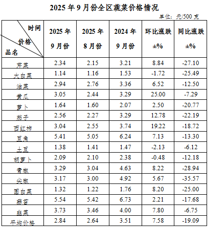 9月份,我区蔬菜价格上涨。全区蔬菜综合平均零售价格为2.84/500克,环比上涨7.58%。监测的15种蔬菜品种价格123降,上涨幅度占前五的品种为黄瓜、西红柿、茄子、芹菜、青椒,分别上涨25.00%19.22%12.78%8.84%8.22%。同比,15个蔬菜品种综合平均零售价格下降19.09%