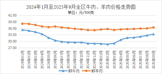 牛肉、去骨羊肉9月全区平均零售价格分别为每50033.30元、36.41元。环比,牛肉、去骨羊肉价格分别上涨1.74%1.20%。同比,牛肉、去骨羊肉价格分别上涨12.88%1.73%