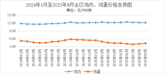 9月份,我区鸡蛋价格涨幅明显。其中鸡蛋价格9月份各旬环比涨幅分别为0.74%1.70%4.07%。白条鸡、鸡蛋9月全区平均零售价格分别为每50012.17元、4.21元。环比,白条鸡、鸡蛋价格分别上涨0.33%4.99%。同比,白条鸡、鸡蛋价格分别下降1.06%26.91%