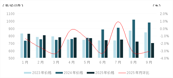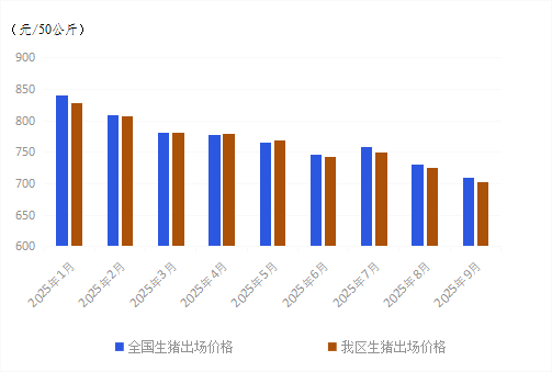 1-9月份,我区生猪出场价格小幅波动下降。一方面,2024年能繁母猪存栏量的变化逐渐传导到2025年生猪出栏量上,前三季度生猪产能逐步释放;同时,今年玉米、豆粕等饲料成本偏低,加上规模化、集约化养殖模式下生产效率不断提升,中大猪出栏较为稳定,生猪市场供应充裕。另一方面,前三季度生猪市场需求季节性变化。1-3月份,先后在“元旦”、“春节”,以及学校开学等因素提振下,猪肉消费需求较为旺盛;4-8月份,随着气温逐渐回升,消费者饮食结构趋于清淡,猪肉消费需求转弱;同时,鸡蛋价格低位运行也对猪肉形成一定替代。9月份,随着高温天气结束,以及各地大中院校集中开学提振猪肉集团消费量,猪肉需求小幅提升。在供应充足、成本偏低的背景下,1-9月份我区生猪出场价格波动下降。9月份我区生猪平均出场价格为702.32/50公斤,与202412月份相比累计下降16.44%