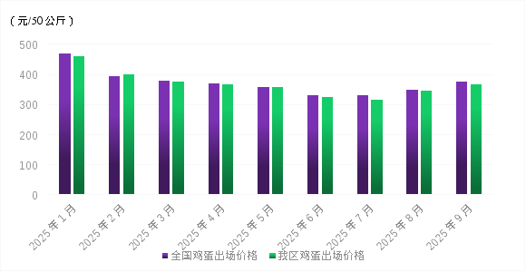 1-9月份,我区鸡蛋出场价格先降后升。今年以来,国内蛋鸡存栏持续高位,养殖端在成本可控以及对秋季鸡蛋行情预期回暖等影响下淘汰意愿偏弱,鸡蛋市场存在一定供应压力。相比之下,鸡蛋市场需求增长相对有限。其中,1月份在“元旦”、“春节”等节日效应提振下,鸡蛋市场需求集中释放;2-3月份,食品加工企业减少对鸡蛋的采购量,且居民家庭以消化存货为主。4-5月份,随着气温逐步回升及“五一”“端午”节日临近,鸡蛋市场需求小幅回升;6-7月份,节日提振效应消退,鸡蛋市场需求回归常态。8-9月份,先后在学校开学、节前备货等提振下,鸡蛋市场需求走强。在供需、成本等因素作用下,1-7月份我区鸡蛋出场价格呈逐步下降走势;8-9月份价格触底反弹,养殖端盈利状况好转。9月份我区鸡蛋平均出场价格为366.66/50公斤,与202412月份相比累计下降22.07%