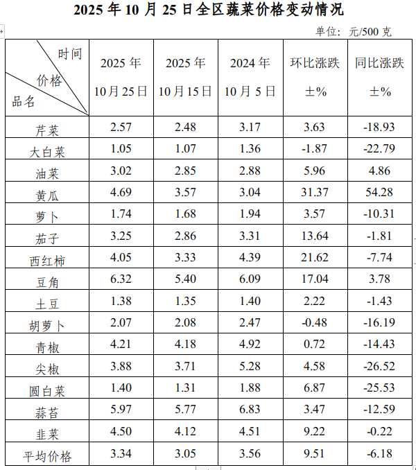 10月25日,全区蔬菜综合平均零售价格为3.34元/500克,环比上涨9.51%。本旬监测的15种蔬菜品种价格13涨2降,上涨幅度居前五位的品种为黄瓜、西红柿、豆角、茄子、韭菜,分别上涨31.37%、21.62%、17.04%、13.64%、9.22%。与去年同期相比,15个蔬菜品种综合平均零售价格下降6.18%。