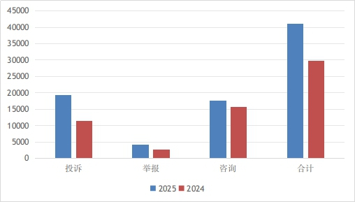 2025年5月份,内蒙古全国12315平台共接收消费者投诉、举报、咨询41004件,同比增长37.26%,环比增长13.16%。其中,投诉19310件,占总量的47.09%;举报4148件,占总量的10.12%;咨询17546件,占总量的42.79%。