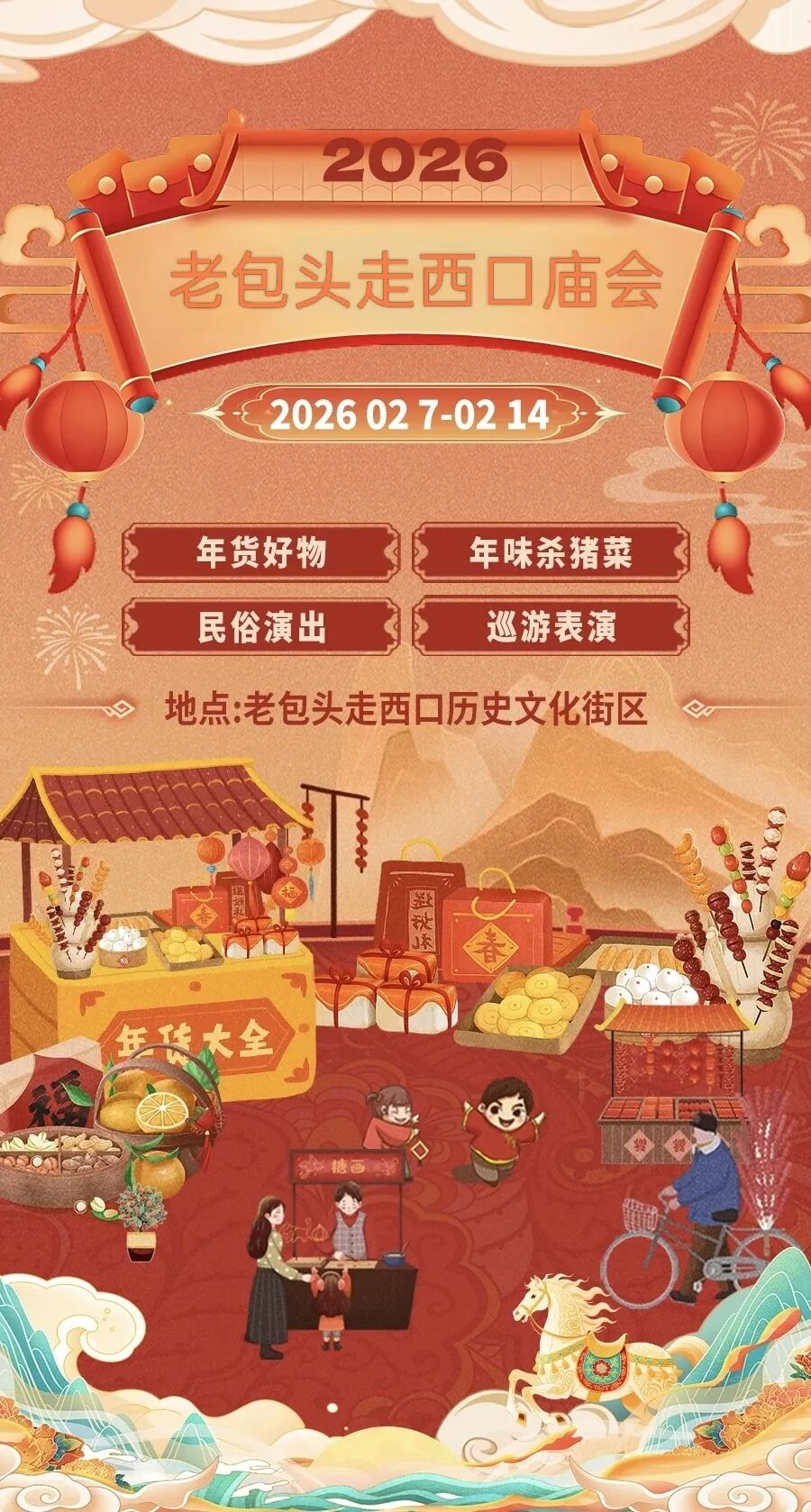01 活动时间2026年2月7日—2026年2月14日(共计8天)02 活动地点名称:老包头走西口历史文化街区地址:内蒙古自治区包头市东河区东北外大街包头召革命纪念馆东03 组织单位主办方:包头走西口文旅有限责任公司承办方:内蒙古纳美文化传媒有限责任公司、内蒙古达可梦文化传媒有限责任公司年货好物01 风味年货 肉食类:牛羊礼盒、家禽、复刻边贸核心肉食交易场景。粮油米面:莜面、炒米、胡麻油、荞面、小米,凸显农耕文化与草原文化食材交融特色。零食小吃类:油香饼、各类奶制品、各类坚果,还原走西口路上便携美食。02 非遗文创与年俗用品  非遗手作:剪纸、核雕挂件、银饰、手工织毯等,邀请非遗传承人现场展示技艺。年俗装饰:“走西口”主题春联、窗花、定制红包、福字等。伴手礼:各类年味礼盒 ,适配走亲访友需求。03 跨界好物  中蒙俄特色商品:本次年货节将汇聚中、蒙、俄三国特色年货商品,包括特色糖果、精选肉类、异国特产等等,让消费者不出国门即可品尝和购买到三国的特色年货。民俗演出巡游表演