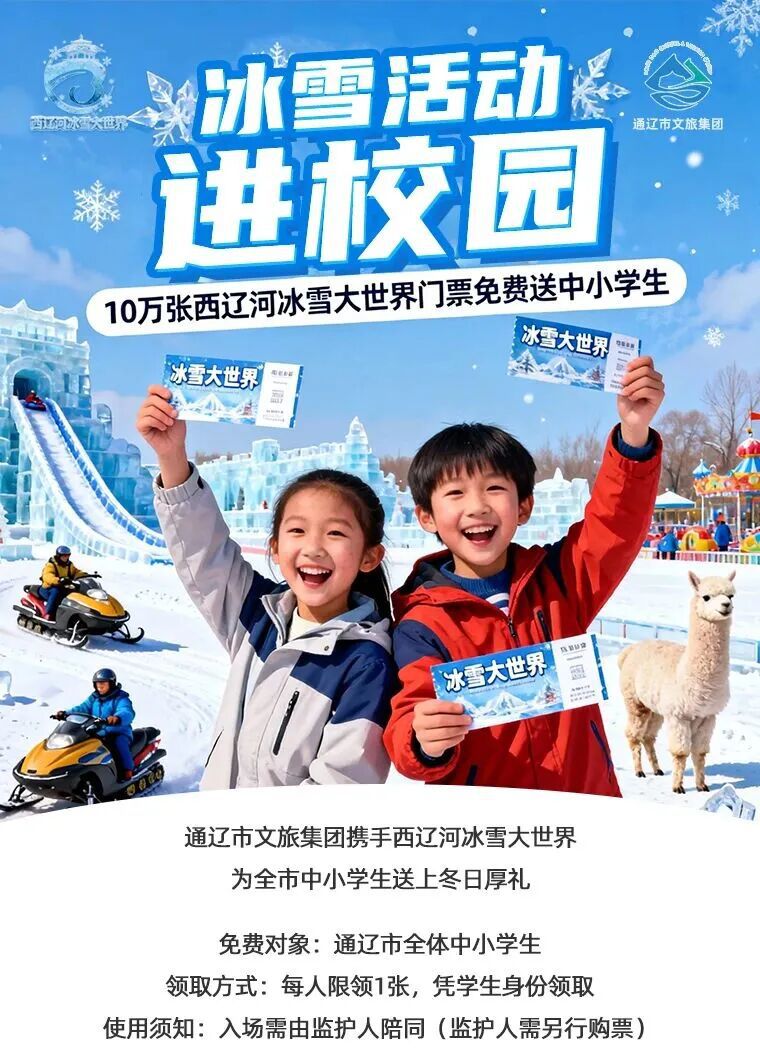 亲爱的市民朋友们:西辽河冰雪大世界火热进行中!通辽市“西辽河冰雪大世界”活动将于2026年1月5日通辽市辽河公园内盛大开园,并持续至2026年2月下旬,为让全市中小学生尽情体验冰雪乐趣,特面向在校中小学生免费发放10万张门票,先到先得!领票与入园指南领票平台:通过“通达智旅”微信小程序预约。领票时间:每天上午9点准时放送5000张,共计放送20天。入园凭证:凭预约成功的电子门票二维码(仅限中小学生使用)。重要提示:未成年人入园需至少一名购票成人陪同。活动基本信息活动地点:通辽市辽河公园内 · 西辽河冰雪大世界活动时间:2026年1月5日至2026年2月下旬一票畅玩,持免费票可畅玩园区内丰富的无动力项目,包括:冰车、雪滑橇、冰上自行车、雪圈、雪地转转、香蕉船、萌宠乐园、雪地碰碰车、雪山攀爬等超20项精彩体验。温馨提示请为孩子做好防寒保暖,遵守场地安全规则,建议错峰出行以获得更佳体验。冰雪乐园已就绪,快为孩子预约一场冬日狂欢吧!