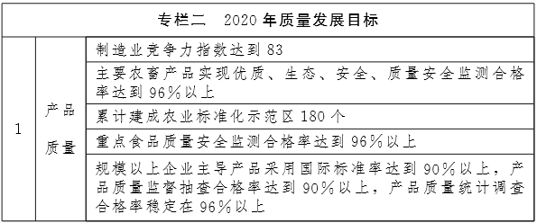 (1)产品质量。到2020年,制造业产品质量大幅提升,制造业竞争力指数达到83,质量安全指标全面达到国家强制性标准要求,规模以上企业主导产品采用国际标准率达到90%以上, 产品质量统计调查合格率稳定在96%以上,产品质量监督抽查合格率达到90%以上;主要农畜产品实现优质、生态、安全, 质量安全监测合格率达到96%以上;累计建成农业标准化示范区180个;重点食品质量安全监测合格率达到96%以上;煤化工、羊绒、乳制品等优势产业产品质量达到国际先进水平。