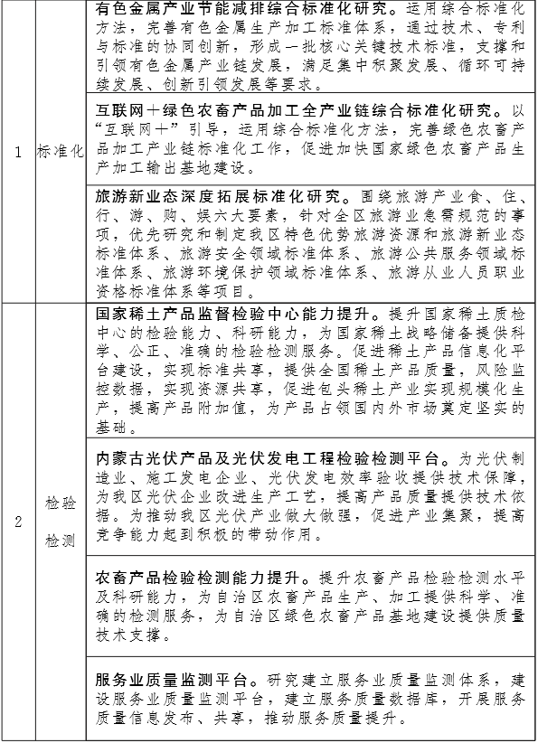 加大高精尖的基础性、关键性检测设施投入和检测技术自主研发力度,开展关键、共性检测技术攻关,研发一批高水平的检验检测方法、技术标准,提升检验检测技术机构的核心竞争力。 推进跨地区、跨部门检验检测机构优化整合,促进不同层级、不同功能、不同所有制检验检测机构各具特色、错位发展。突出国家级、自治区级质检中心建设,提高盟市级检验检测机构综合性检验检测能力,形成布局合理、实力雄厚、科学公正的检验检测服务体系。支持检验检测技术机构加强与国内外技术机构的合作,实现检验检测结果国际或地区间互认。加快质量检测公共服务平台建设,面向社会和企业开展质量检测、技术标准、风险预警、研发创新和咨询培训等方面的优质服务。对检验检测技术机构实施分类指导和监管,规范检验检测行为,提高检验检测质量和服务水平。到2020年建成国家级检验检疫重点实验室3家、 国家质检中心10家、自治区质检中心20家、产业计量测试中心2家,重要日用消费品质量安全监管检验检测能力覆盖率达95%以上、矿产资源质量检验检测能力覆盖率达90%以上。