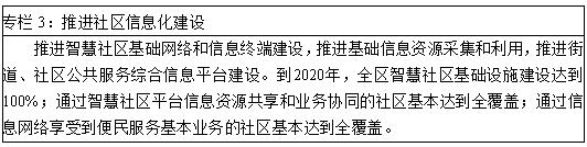 ——加强智慧社区建设。加快推进智慧社区基础网络、信息终端、基础信息资源建设采集和利用,完善社区信息化发展运行机制,按照“基础设施高端化、政府服务协同化、公共服务网络化、区域管理智能化、社区服务集成化、居民生活现代化”的标准探索推进智慧社区建设。健全完善社区居民、家庭、社会组织、商业网点电子档案,实现社区服务队伍、服务人员、服务对象信息数字化,发展城乡社区电子商务,发展线上线下相结合的社区服务新模式。