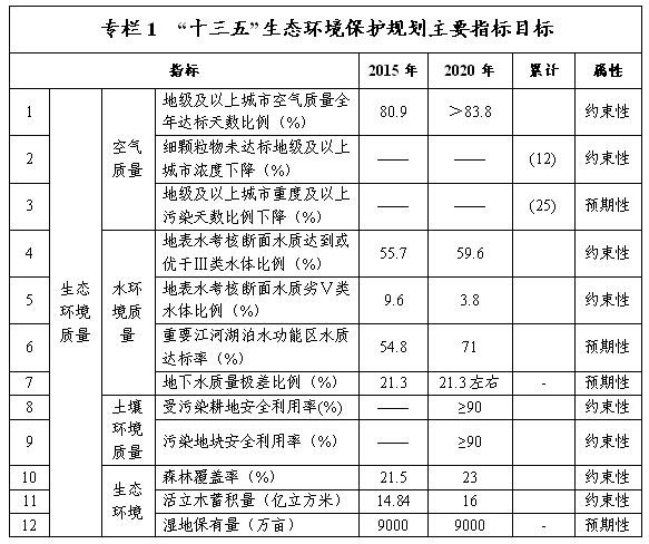 ——环境质量控制目标指标。到2020年,大气环境质量方面,地级及以上城市空气质量全年达标天数比例平均达到83.8%以上,重度及以上污染天数比例下降25%,未达标地级及以上城市  PM  2.5年均浓度下降12%。水环境质量方面,全区地表水质量考核断面水质达到或优于Ⅲ类比例总体达到59.6%,劣Ⅴ类水质比例控制在3.8%,重要江河湖泊水功能区水质达标率达到71%,全区地下水质量考核点位水质级别保持稳定且极差比例控制在21.3%。土壤环境质量方面,全区土壤环境质量总体保持稳定,农用地和建设用地土壤环境安全得到基本保障,受污染耕地安全利用率和污染地块安全利用率均达到90%以上。生态环境质量方面,森林覆盖率达23%,活立木蓄积量达16亿立方米,湿地保有量达9000万亩,草原植被盖度达到45%,重点生态功能区所属县域生态环境状况指数达到48.9以上。