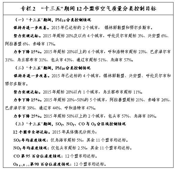 ——污染物排放总量控制目标。到2020年,全区化学需氧量、氨氮、二氧化硫和氮氧化物排放总量分别控制在77.66万吨、4.37万吨、109.56万吨和101.37万吨以内,比2015年的83.56万吨、4.69万吨、123.09万吨和113.88万吨分别减少7.1%、7%、11%和11%。呼伦湖、乌梁素海汇水范围内总氮减少10%。