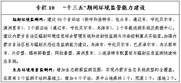 继续强化监测、监察、在线监控、科研、信息、宣教、固废、统计等基础能力建设,特别加强基层环保能力建设,全面提升自治区环境监管能力建设水平。从自治区到旗县各级深入推进环境监测、监察、在线监控、信息、辐射、宣教等监管能力运行保障机制建设,强化生态环境监测网络、污染源在线监控网络、环境信息网络等的运行保障,根据事权完善经费保障渠道和机制,按照有关规定,保障监测、监察、预警与应急、信息、污染源在线监控等运行经费。力争到2020年,我区环境监测、监察、在线监控、环境信息、辐射环境监测、宣教、固废管理等监管能力机构建设能够实现自治区、盟市、旗(县、区)三级全覆盖,综合业务能力取得突破性进展。