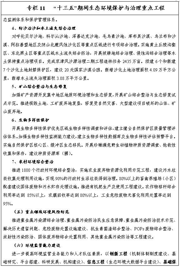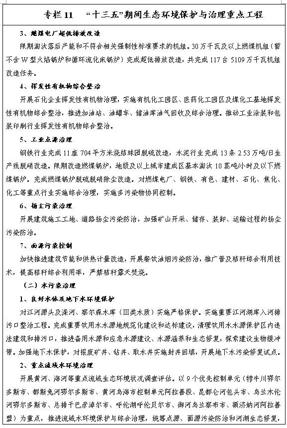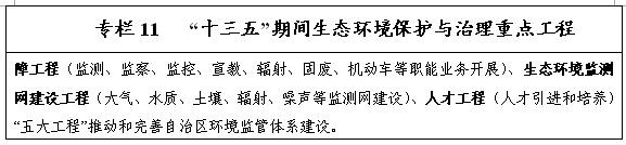 为有效推进主要任务实施,保障规划目标实现,规划重点实施大气污染治理、水污染治理、土壤污染治理、生态保护与修复、重点领域环境风险防范、环境监管能力建设等六大类重点工程。建立项目库,强化项目绩效管理。项目投入以企业和地方政府为主,国家和自治区财政应当予以支持。