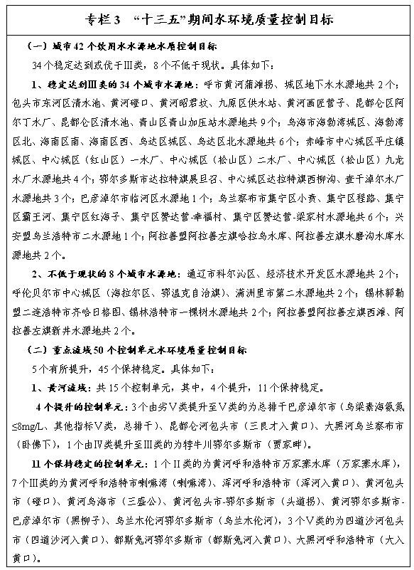 强化用水总量控制,以水定产、以水定城,逐步建立覆盖自治区、盟市、旗县区三级行政区域的用水总量控制体系,造纸、印染等重点行业实施行业取水量控制。实施用水强度控制,加强工业节水技术改造和循环用水,积极推广再生水回用,提高工业用水重复利用率,电力、煤化工、钢铁、印染、造纸、石化、食品发酵等高耗水行业达到先进定额标准。推进城镇节水改造和设施建设,积极推动海绵城市建设和雨水收集利用,加快实施大中型灌区续建配套节水改造工程。健全完善节约用水ld体育中国官方网站机制,加快沿黄地区水权置换,进一步完善取水许可制度。到2020年,全区用水总量控制在211亿立方米,万元工业增加值用水量较2015年降低20%。