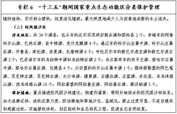 对已经发生退化或沙化的天然草地,加强改良和建设。对集中连片、破碎化严重、功能退化的自然湿地,进行修复和综合整治,优先修复生态功能严重退化的重要湿地,逐步恢复湿地生态系统功能。对坡耕地、侵蚀沟、东北黑土区等水土流失较严重的区域,大力实施水土流失治理工程,重点治理黄河十大孔兑、呼伦贝尔市和兴安盟8个旗县的黑土区,到2020年,新增水土流失治理面积3.08万平方公里。对土地沙化较严重地区,推进封禁保护区和防沙治沙综合示范区建设,发挥生态系统的自我修复功能。