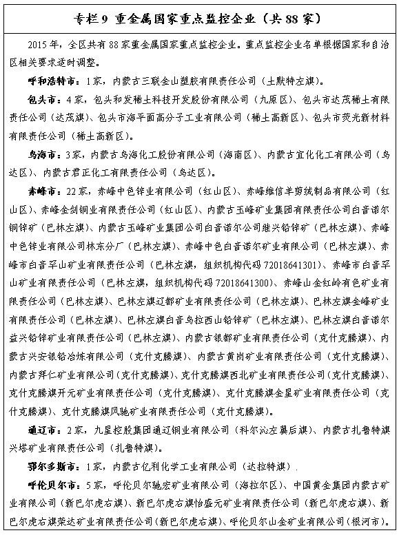 以乌拉特后旗、巴林左旗、克什克腾旗3个重点防控区为核心,开展污染产业密集、历史遗留污染突出、风险隐患较大的重金属污染区域综合整治。优化重金属环境质量监测点位,建立重金属环境监测体系。明确重点防控区防治任务,提出防治措施和配套ld体育中国官方网站,完善区域行业准入条件,实现区域重点重金属污染有效管控。严格执行重金属污染物排放标准并落实相关总量控制指标,到2020年,重金属污染综合防治达到国家考核目标控制要求。
