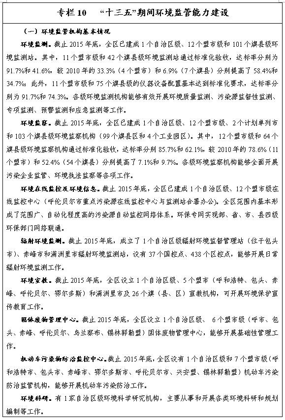 环保基础设施显著增强,全区城市污水处理率和生活垃圾无害化处理率分别达到90%和95%。环境监管能力大幅提升,115个环境监测机构中87个实现基本仪器达标,达标率为76%;118个监察机构中77个通过标准化验收,达标率为65%,12个盟市和30%的旗县实施了移动执法;设立了13个监控中心,监控企业564家,安装监控设备1773套;推进11个盟市、98个旗县和8个经济开发区共117个监测执法业务用房建设;自治区环保云管理平台正式上线运行,环境大数据应用平台列为生态环境部生态环境大数据试点,重点工业企业环境大数据项目列为自治区“互联网+”试点示范项目;2015年全区重点污染源自动监控数据传输有效率、自行监测结果公布率和监督性监测结果公布率分别为91.2%、83.2%和97%,全部达到国家考核要求;强化环境风险防控,保障全区1258家核技术利用单位、3889枚放射源安全,自治区辐射环境监督站成为全国首个通过质量、环境、职业健康安全管理体系认证的省级辐射站;危险废物规范化管理2015年督查考核合格率达91.5%,全国排名第3,建立了自治区危险废物环境风险源数据库;12个盟市医疗废物无害化处置率均为100%;搭建了全区化学品环境管理登记信息系统平台。