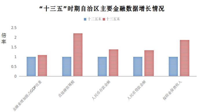 金融总体实力进一步增强。“十三五”时期,全区金融业增加值占GDP的比重从2015年的4.8%增长到2020年的5.1%,对经济社会发展的贡献度进一步提高。银行业存贷款规模稳步提高,全区金融机构人民币存款余额由2015年末的1.8万亿元增长到2020年末的2.5万亿元,年均增幅6.79%;贷款余额由1.7万亿元增长到2.3万亿元,年均增幅6.23%。保险业保费收入持续增长,由2015年末的395.5亿元增加至2020年末的740亿元,年均增幅13.35%。利用资本市场取得积极进展,2020年直接融资规模突破2000亿元大关,达到2643.5亿元,占社会融资规模比重逐年提高。“十三五”期间,新增1家公司在香港上市,1家公司进入全国首批新三板精选层。截至2020年末,全区共有境内上市公司26家,香港上市公司6家,新三板挂牌公司50家。