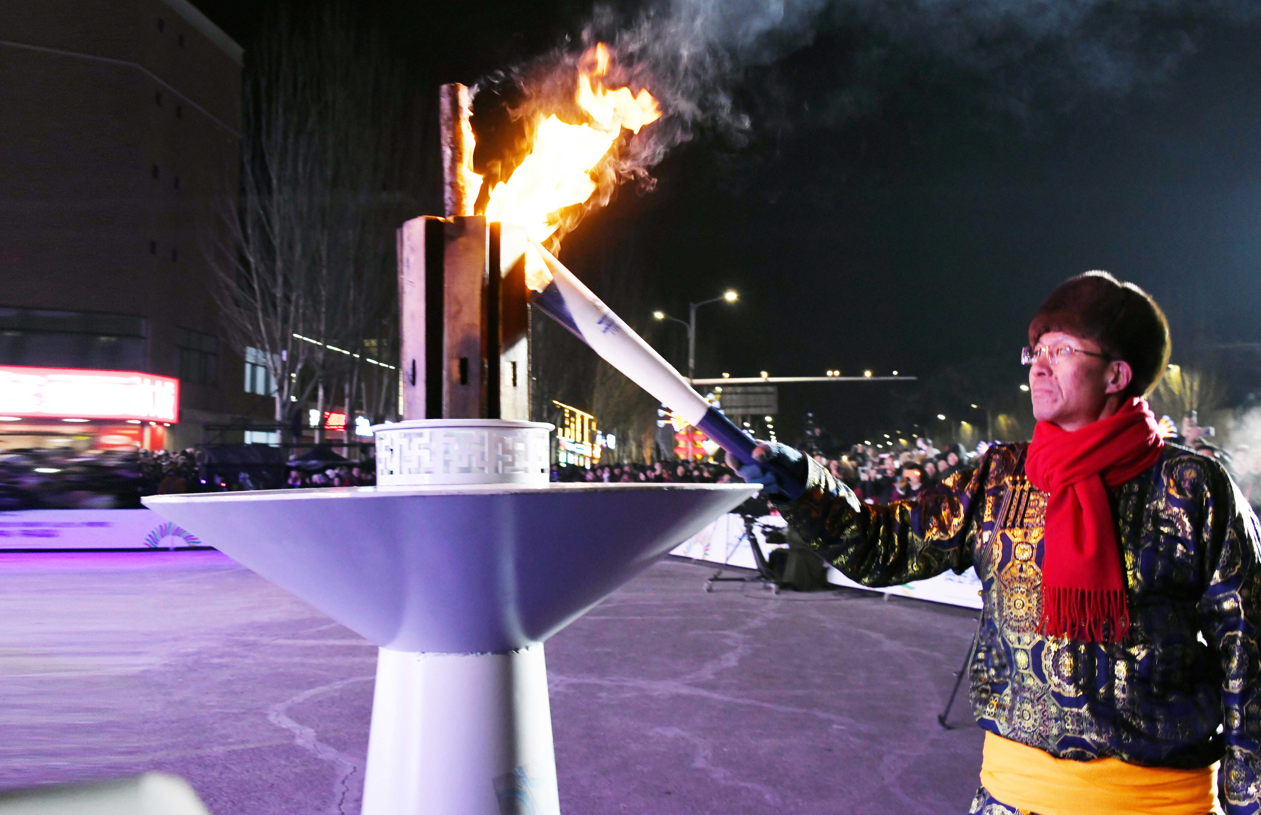 热场环节结束后,开幕式正式开启。万众期待的点燃圣火仪式如期而至,象征着团结、奋进与希望的火焰在寒风中升腾跳跃,照亮了整片冰雪草原。