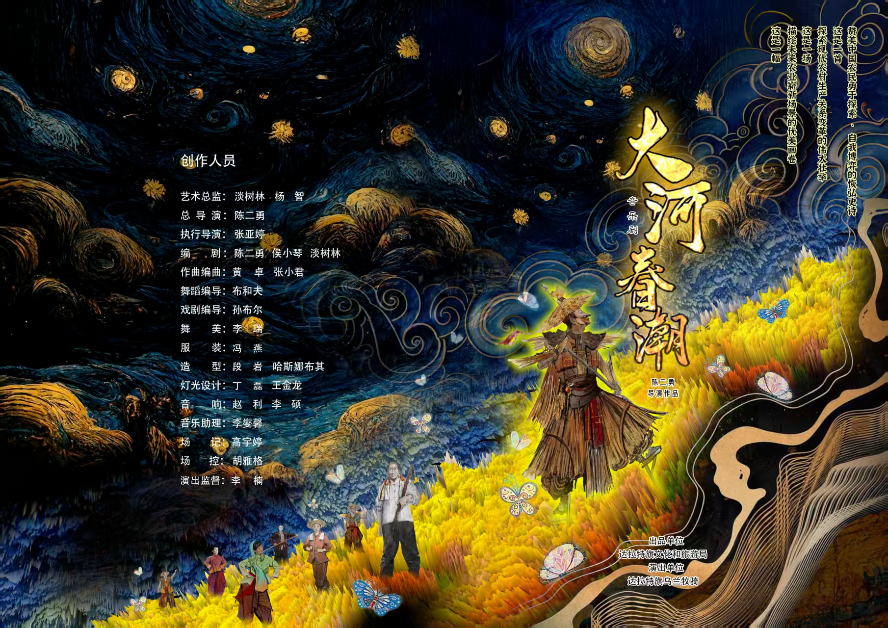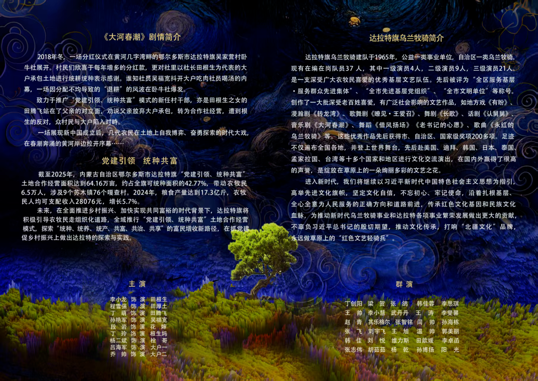 剧目简介2018年冬,一场分红仪式在黄河几字湾畔的鄂尔多斯市达拉特旗吴家营村卧牛社展开。村民们欣喜于每年增多的分红款,更对社里以社长田根生为代表的大户承包土地进行统耕统种表示感谢。谁知社员吴福宽揭开大户吃肉社员喝汤的内幕,一场因分配不均导致的“退耕”的风波在卧牛社爆发。 致力于推广“党建引领、统种共富”模式的新任村干部,亦是田根生之女的田腾飞站在了父亲的对立面,劝说父亲放弃大户承包,转为合作社经营,遭到田根生的反对,众村民与大户陷入对峙。一场展现中华人民共和国成立后,几代农民在土地上自我博弈、奋勇探索的时代大戏,在春潮奔涌的黄河岸边拉开序幕……     党建引领 统种共富截至2025年,内蒙古自治区鄂尔多斯市达拉特旗“党建引领、统种共富”土地合作经营面积达到64.16万亩,约占全旗可统种面积的42.77%,带动农牧民6.5万人。涉及9个苏木镇76个嘎查村。2024年,粮食产量达到17.3亿斤。农牧民人均可支配收入28076元,增长5.7%。未来,在全面推进乡村振兴、加快实现共同富裕的时代背景下,达拉特旗将积极引导农牧民走组织化道路,全域推行“党建引领、统种共富”土地合作经营模式,探索“统种、统养、统产、共富、共治、共享”的富民增收新路径,在抓党建促乡村振兴上做出达拉特旗的探索与实践。演出信息主办单位中共鄂尔多斯市委员会宣传部鄂尔多斯市文化和旅游局承办单位中共达拉特旗委员会宣传部达拉特旗文化和旅游局演出单位达拉特旗乌兰牧演出时间2026年1月14日(周三)19:30演出地点鄂尔多斯大剧院·歌剧厅演出团体达拉特旗乌兰牧骑建队于1965年,公益一类事业单位,自治区一类乌兰牧骑,是一支深受广大农牧民喜爱的优秀基层文艺队伍。先后被评为“全区服务基层·服务群众先进集体”、“全市先进基层党组织”、“全市文明单位”等称号。创作了一大批深受老百姓喜爱,有广泛社会影响的文艺作品,如地方戏《有盼》、漫瀚剧《转龙湾》、歌舞剧《瞭见·王爱召》、舞剧《长歌》、话剧《认舅舅》、音乐剧《大河春潮》、舞蹈《借风扬场》《老书记的心愿》、歌曲《永红的乌兰牧骑》等。这些优秀作品先后获得市、自治区、国家级奖项200多项。足迹不仅遍布全国各地,还登上世界舞台,先后赴美国、迪拜、韩国、日本、泰国、孟加拉国等十多个国家和地区进行文化交流演出,在国内外赢得了很高的声誉,是绽放在草原上的一朵绚丽多彩的文艺之花。进入新时代,我们要继续以习近平新时代中国特色社会主义思想为指引,高举先进文化旗帜,坚定文化自信,不忘初心、牢记使命,沿着扎根基层、全心全意为人民服务的正确方向和道路前进,传承红色文化基因和民族文化血脉,为推动新时代乌兰牧骑事业和达拉特各项事业繁荣发展做出更大的贡献,不辜负习近平总书记的殷切期望,推动文化传承,永远做草原上的“红色文艺轻骑兵”。