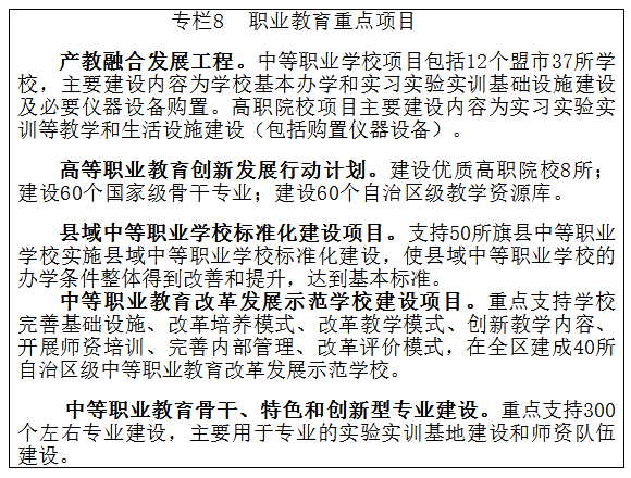 实施现代职业教育质量提升工程,全面加强中等职业教育基础能力建设。办好城市中等职业学校,加快发展农村牧区中等职业学校。落实中等职业学校分类分专业的生均财政拨款制度。加大对职业院校的投入,改善办学条件特别是实习实训条件,加强建设“双师型”教师队伍。实施职业教育产教融合发展工程,推动振兴东北老工业基地产业转型技术技能人才“双元”培育试点改革,提高学生技术技能水平和就业创业能力,为培养大国工匠打下坚实基础。积极推进高职院校学分制改革试点,自治区15所示范性高职院校全面实行学分制。实施高等职业教育创新发展行动计划和管理水平提升行动计划,提升高职院校发展质量。