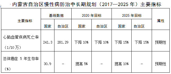 到2020年,“政府主导、部门协作、动员社会(同上)、全民参与”的慢性病防控格局基本形成,防控环境显著改善;到2025年,慢性病危险因素得到有效控制,实现全人群全生命周期健康管理,居民健康期望寿命进一步提高,有效缓解和控制慢性病疾病负担。30-70岁人群因心脑血管疾病、癌症、慢性呼吸系统疾病和糖尿病导致的过早死亡率,力争2020年较2015年降低10%、2025年降低20%。