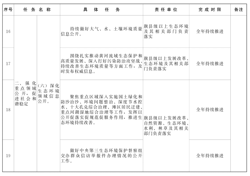 (六)深化生态环境领域信息公开。持续做好大气、水、土壤环境质量信息公开。围绕扎实推动黄河流域生态保护和高质量发展、深入打好污染防治攻坚战、持续改善生态环境质量等方面工作,及时发布权威信息。聚焦重点区域深入实施国土绿化和防沙治沙、环境问题整治、深度节水控水、十大孔兑综合治理、滩区居民迁建、重点河湖湿地综合治理等工作,发挥以公开促落实促规范促服务作用,推进生态环境持续改善。做好中央第三生态环境保护督察组交办群众信访举报案件办理情况的公开工作。