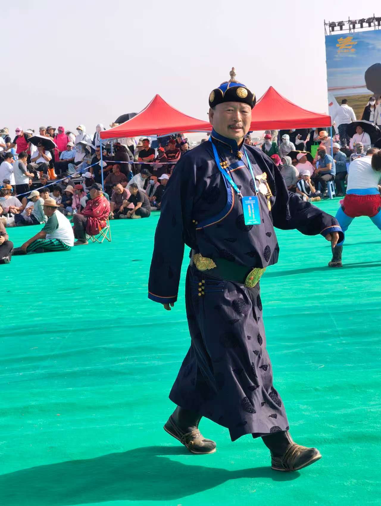 62岁的国家级非物质文化遗产项目沙力搏尔式摔跤代表性传承人、阿拉善左旗中国沙力搏尔式摔跤搏克协会会长阿拉腾乌拉坐在观礼台上,如数家珍地介绍:“沙力搏尔式摔跤与传统搏克不同,服装也不一样,摔跤手只穿短裤,上身是赤裸着的。不过,随着社会进步和时代发展,沙力搏尔的服装也在改进,比如盖头,不仅有红、黄、蓝多种颜色,而且还大都绣有蒙古族的吉祥图案,在彰显力量的同时也显示出了美。”