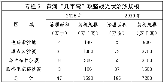 (二)推进以林光牧光相结合的光伏治沙模式,助力打赢黄河“几字弯”攻坚战。在毛乌素沙地、库布其沙漠、乌兰布和沙漠、腾格里东部沙漠及周边,采用适应干旱、半干旱环境的抗沙尘、高效率光伏技术路线,统筹光伏开发、生态旅游、工业园区等分区域用途管理,对较集中区块进行光伏规模化开发,在沙漠、沙地边缘居住区进行光伏分布式开发。到2025年建成光伏装机1590万千瓦,到2030年达到7200万千瓦。推进种植耐旱、固土的多年生草本植物,在有条件的地区探索种养结合模式,实现林光互补和牧光互补。到2025年完成光伏治沙面积47万亩,到2030年完成光伏治沙面积约185万亩。